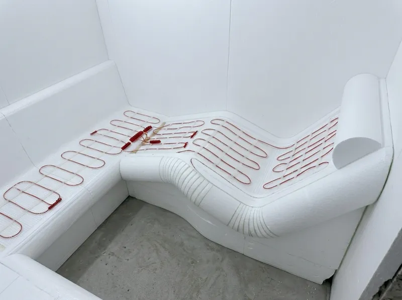 Jednotlivé polystyrenové díly sestavíme k sobě tak, aby dokonale lícovaly. Spojíme je pomocí speciálních lepidel určených pro stavební polystyren. Postupně tak vzniká kompletní tvar parní lázně včetně lavic a dalších prvků.