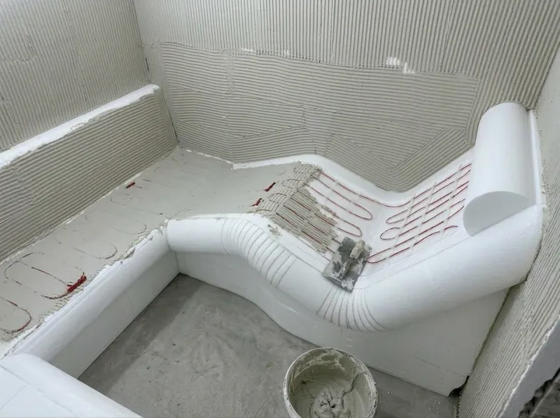 Jakmile je konstrukce slepená, můžeme přejít ke stěrkování. Veškeré spoje, hrany a přechody se pomocí stěrky důkladně vyplní a zahladí. Stěrka na povrchu lavic i stěn vytvoří hladký a voděodolný povrch, který je připravený pro další vrstvy a finální obklad.